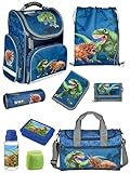 Wichtigste Highlights- LIEFERUMFANG (9 tlg): Dino Schulranzen, Turnbeutel, Schüleretui (die Federmappe ist nicht gefüllt), Schlamper-Rolle, Geld-/ Brustbeutel, Sporttasche (Maße: ca. 35 x 24 x 16 cm | Material: Polyester | mit Reißverschluss-Hauptfach), Brotzeit-Dose und Trink-Flasche (400ml) aus Kunststoff, Familando Regenschutz-Hülle